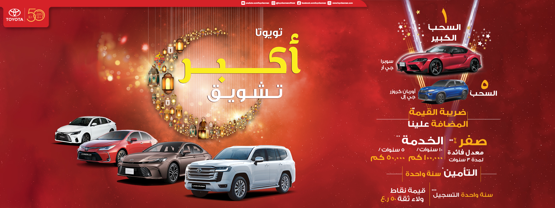 *التأمين شامل لمدة سنة واحدة (عُمان فقط،باستثناء فئات الديزل) على طرازات ياريس، كورولا، كامري، كامري إتش إي ڤي، كراون، فورشنر، برادو،إنوفا. ميزة التأمين ضمن هذا العرض مقدمة وفقًا للحد الساري على السيارات الخاصة فقط، ويجب على شركات تأجير السيارات وأصحاب سيارات الأجرة ومدارس تعليم السياقة دفع مبلغ إضافي حسب معايير التأمين.